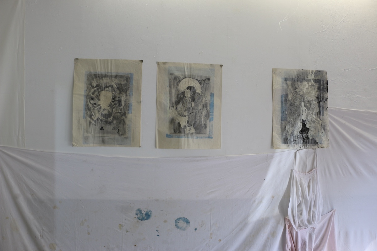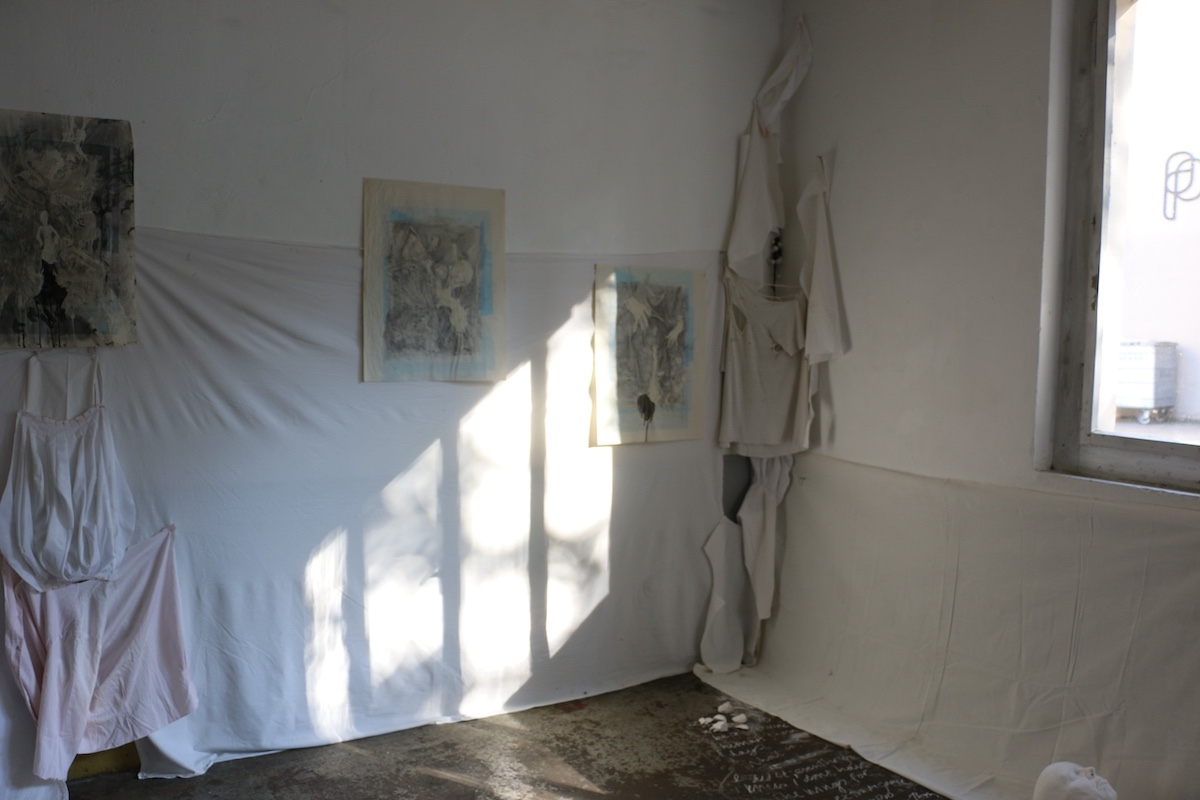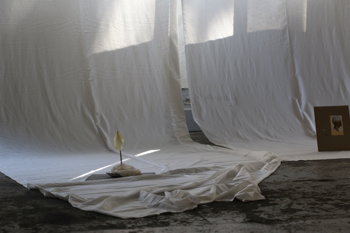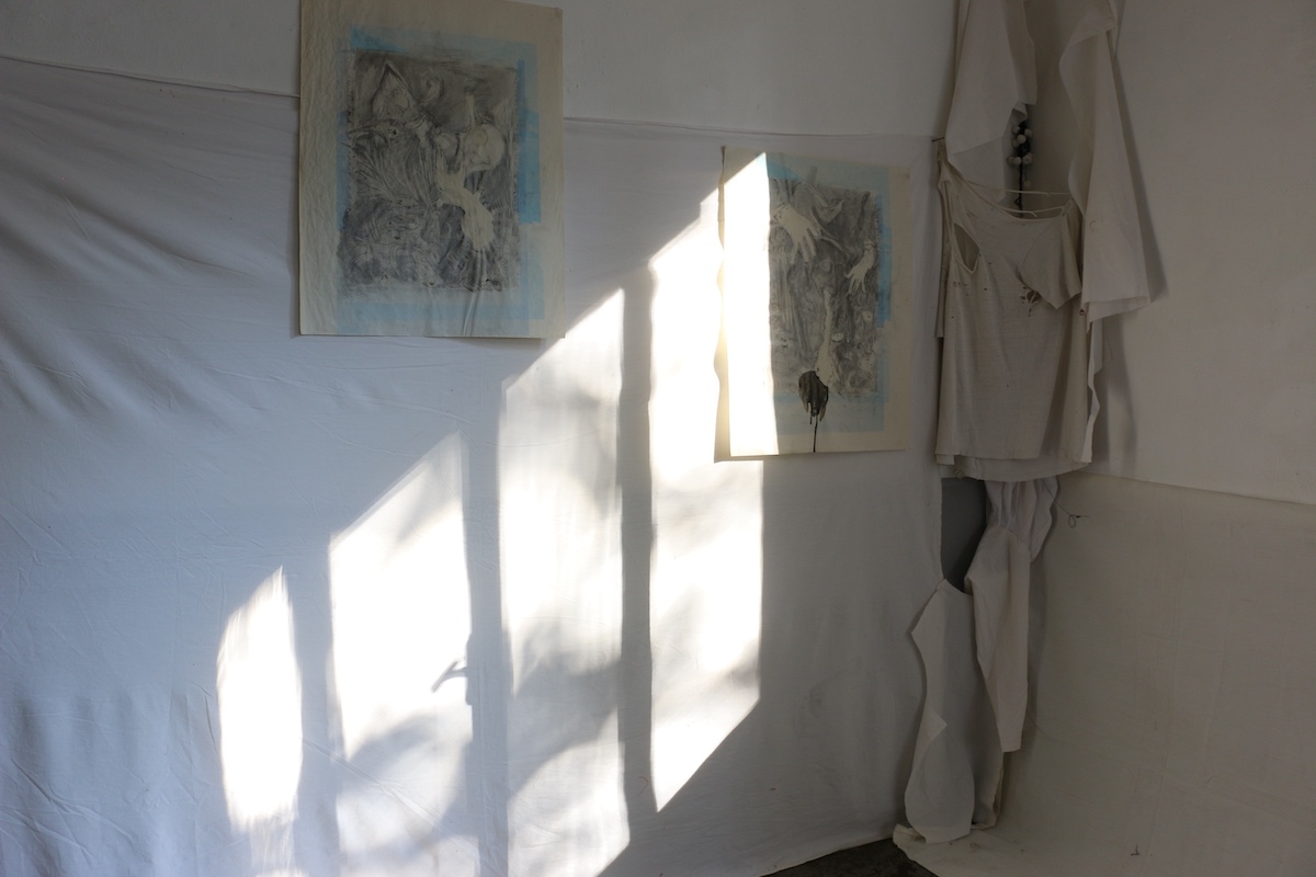 └── Materials: cloth, objects, drawings, dust, glass, cleaning cloth, stains, dirt, plaster, chalk, paper, pencil, video projection, table cloth. Parents as performers, works on paper.