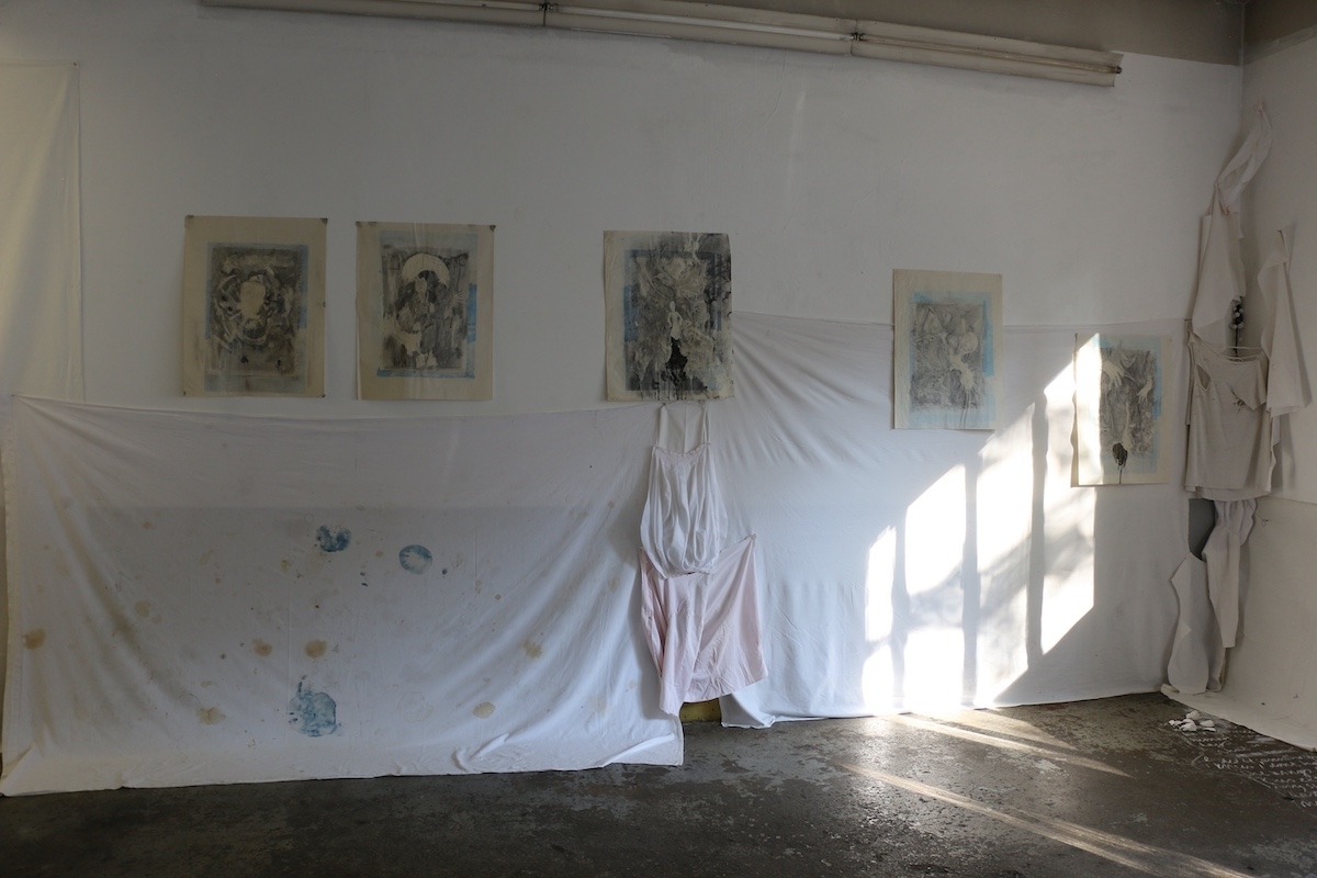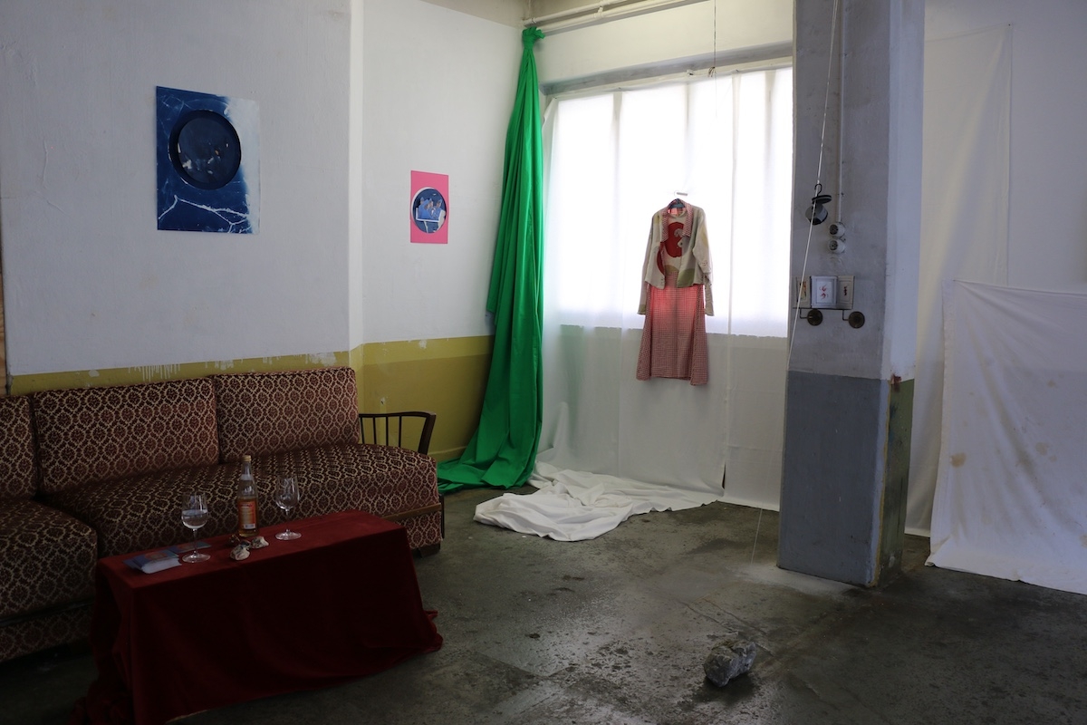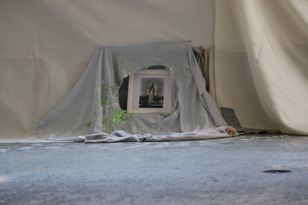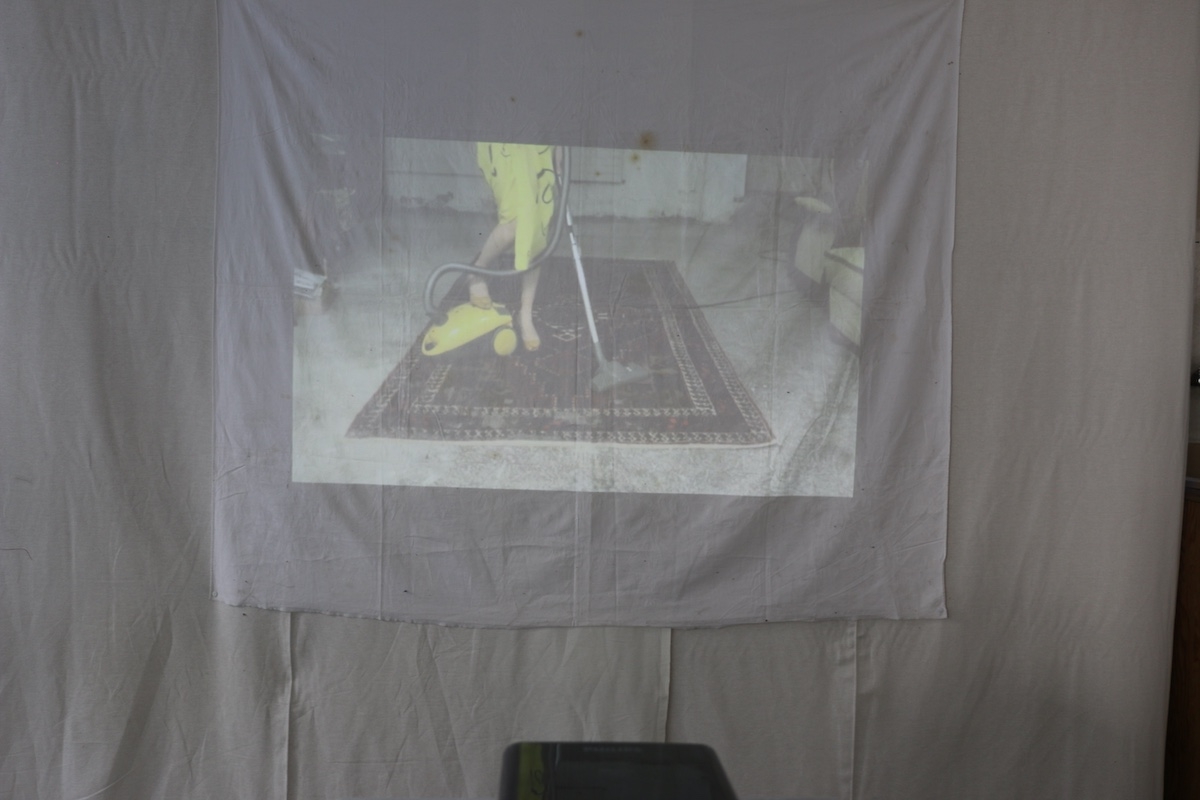 └── Materials: cloth, objects, drawings, dust, glass, cleaning cloth, stains, dirt, plaster, chalk, paper, pencil, video projection, table cloth. Parents as performers, works on paper.